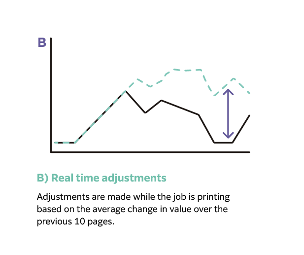 The module doesn’t react to every minor fluctuation. To avoid overcorrection, it calculates averages from the last ten printed sheets. For example, only when a deviation exceeds a preset threshold does it trigger an alert, either to inform the operator, or to pause the job, depending on the settings, but only ever triggering an alert when a drastic deviation occurs. This allows for smooth, gradual adjustments to ensure that the print quality remains stable and consistent without introducing unwanted fluctuations.